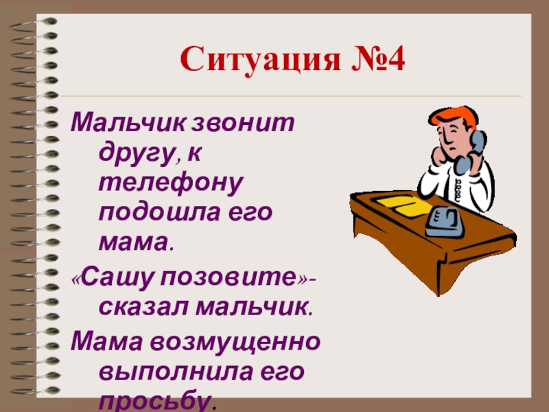 Ситуация №4Мальчик звонит другу, к телефону подошла его мама.«Сашу позовите»- сказал мальчик.Мама возмущенно выполнила его просьбу.Как вы