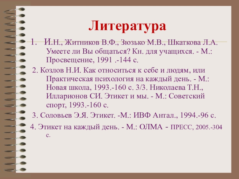 Литература1.   И.Н., Житников В.Ф., Зюзько М.В., Шкаткова Л.А. Умеете ли Вы общаться? Кн. для учащихся. - М.: