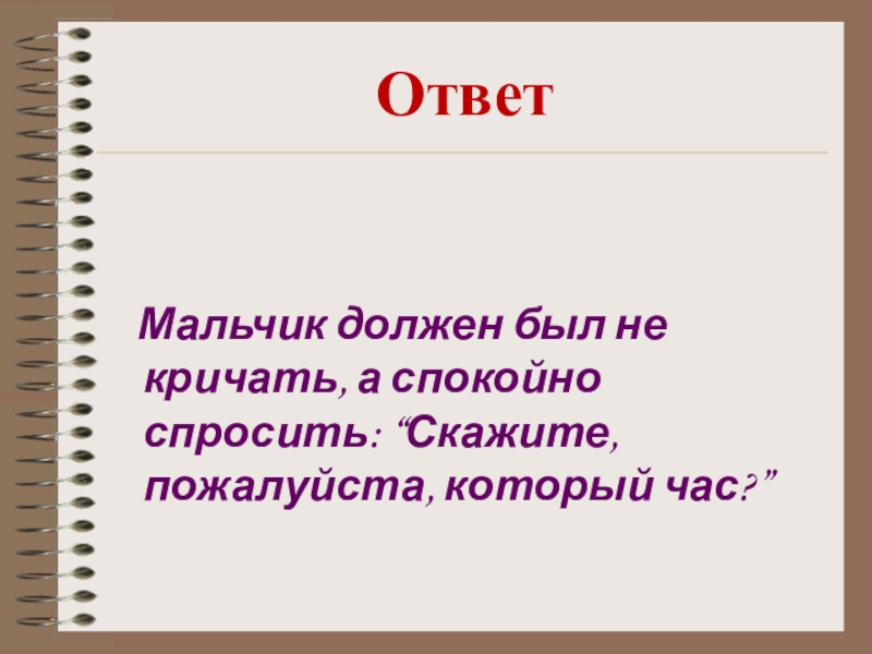 Ответ  Мальчик должен был не кричать, а спокойно спросить: “Скажите, пожалуйста, который час?”