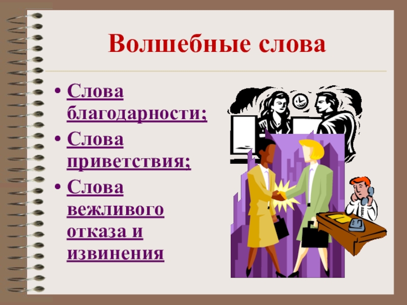 Волшебные словаСлова благодарности;Слова приветствия;Слова вежливого отказа и извинения