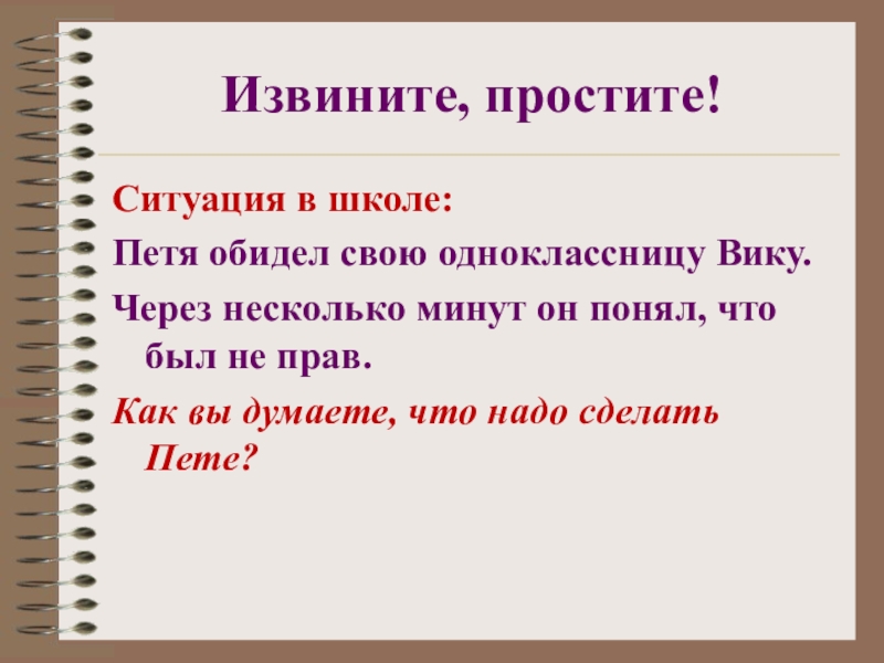 Извините, простите!Ситуация в школе:Петя обидел свою одноклассницу Вику.Через несколько минут он понял, что был не прав.Как вы