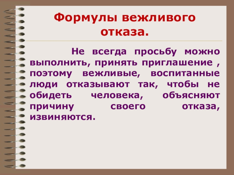 Формулы вежливого отказа.    Не всегда просьбу можно выполнить, принять приглашение , поэтому вежливые, воспитанные