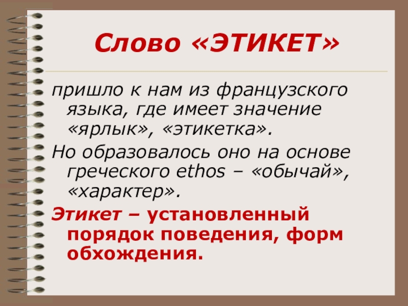 Слово «ЭТИКЕТ»пришло к нам из французского языка, где имеет значение «ярлык», «этикетка». Но образовалось оно на основе