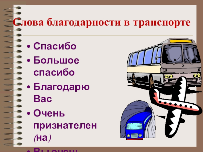 Слова благодарности в транспортеСпасибоБольшое спасибоБлагодарю ВасОчень признателен(на)Вы очень любезныБлагодарствую