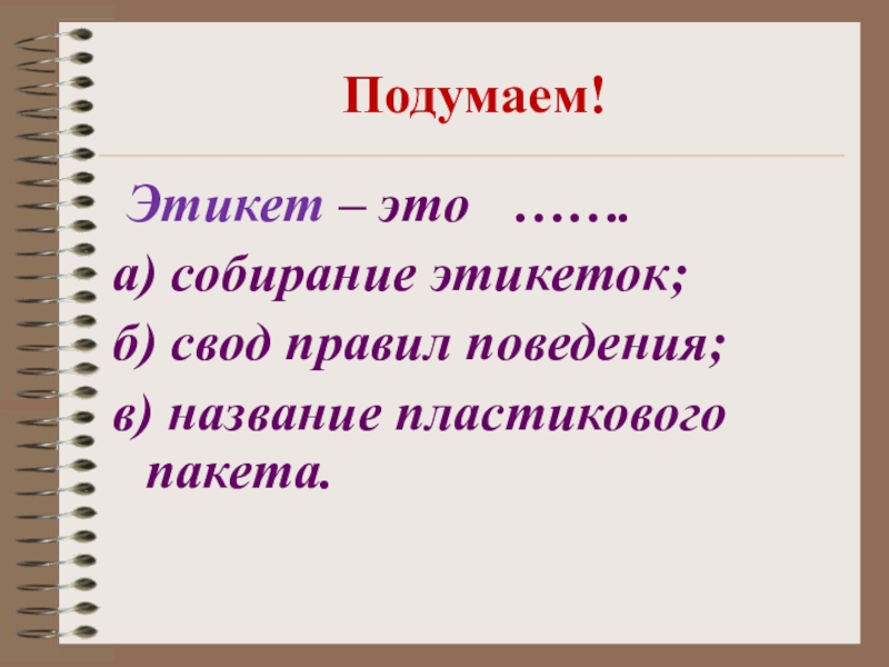 Подумаем! Этикет – это  …….а) собирание этикеток;б) свод правил поведения;в) название пластикового пакета.