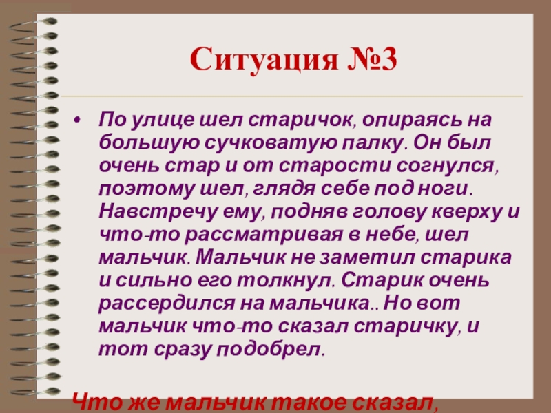 Ситуация №3По улице шел старичок, опираясь на большую сучковатую палку. Он был очень стар и от старости