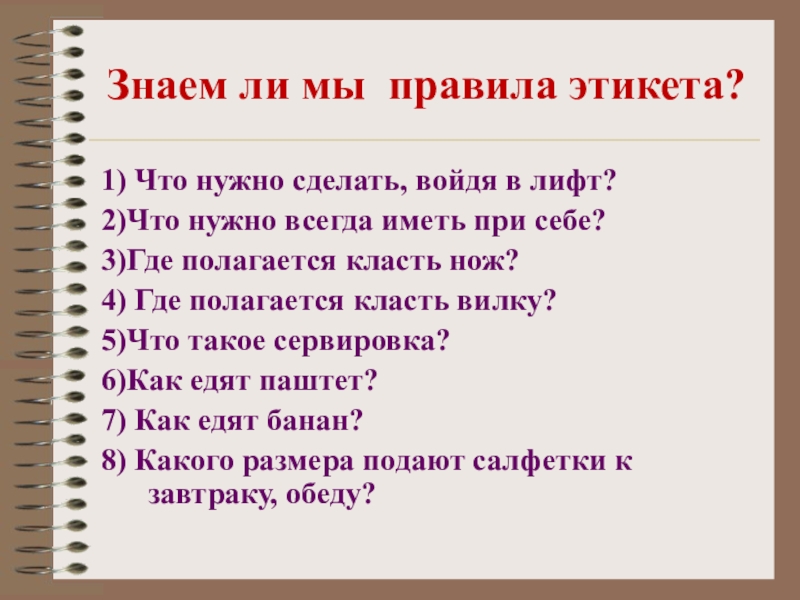 Знаем ли мы правила этикета?1) Что нужно сделать, войдя в лифт?2)Что нужно всегда иметь при себе?3)Где полагается