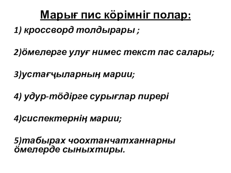 Марығ пис кӧрімніг полар: 1) кроссворд толдырары ;2)ӧмелерге улуғ нимес текст пас салары;3)устағҷыларныӊ марии;4) удур-тӧдірге сурығлар пирері4)сиспектерніӊ марии;5)табырах чоохтанчатханнарны ӧмелерде сыныхтиры.