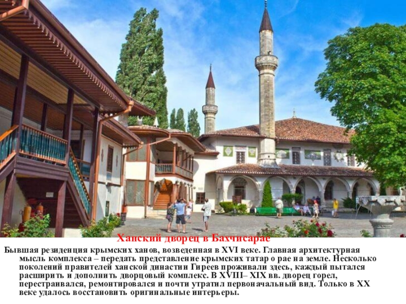 Главная архитектурная мысль комплекса – передать представление крымских татар о рае на земле. Несколько поколений правителей ханской династии Гиреев проживали здесь, каждый пытался расширить и дополнить дворцовый комплекс. В XVIII– XIX вв. дворец горел, перестраивался, ремонтировался и почти утратил первоначальный вид. Только в XX веке удалось восстановить оригинальные интерьеры.