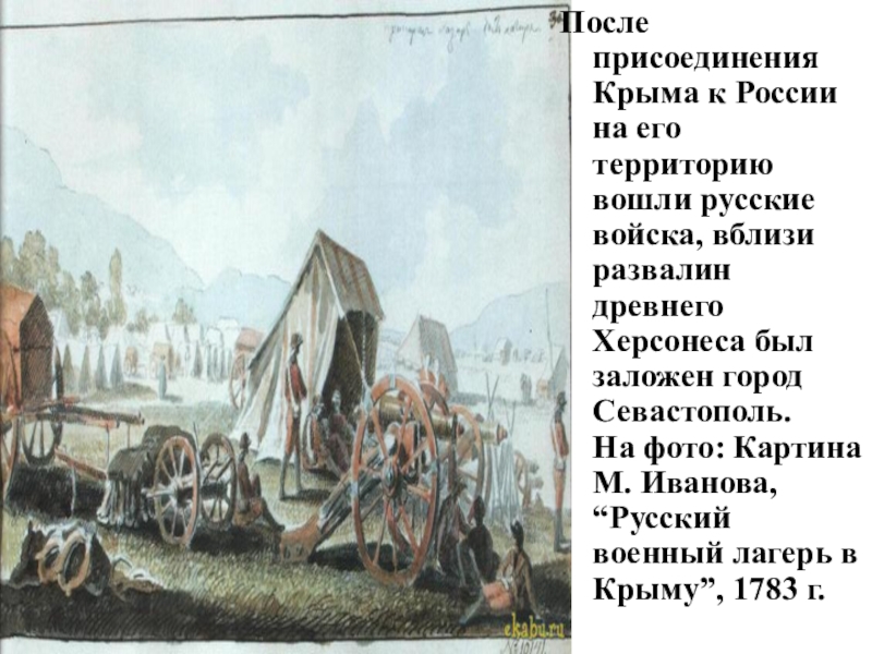 На фото: Картина М. Иванова, “Русский военный лагерь в Крыму”, 1783 г.