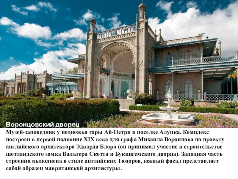 в первой половине XIX века для графа Михаила Воронцова по проекту английского архитектора Эдварда Блора (он принимал участие в строительстве шотландского замка Вальтера Скотта и Букингемского дворца). Западная часть строения выполнена в стиле английских Тюдоров, южный фасад представляет собой образец мавританской архитектуры.