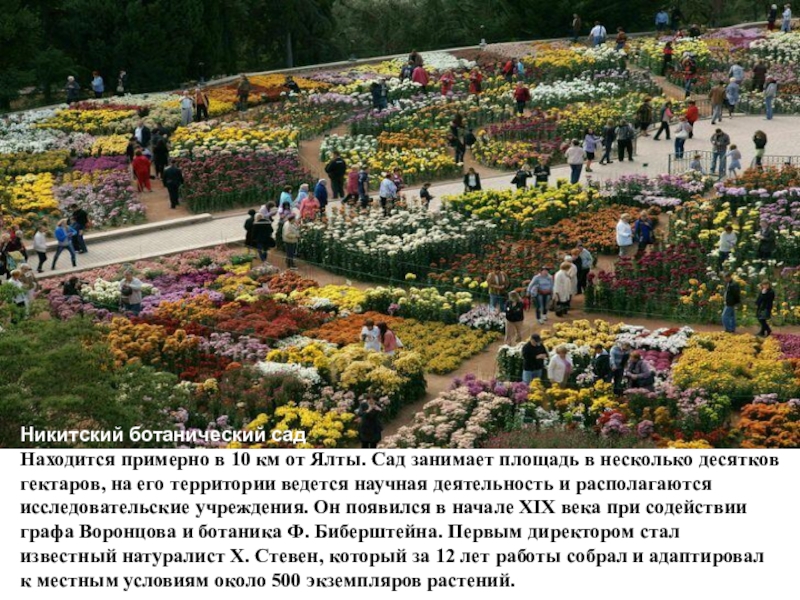 площадь в несколько десятков гектаров, на его территории ведется научная деятельность и располагаются исследовательские учреждения. Он появился в начале XIX века при содействии графа Воронцова и ботаника Ф. Биберштейна. Первым директором стал известный натуралист Х. Стевен, который за 12 лет работы собрал и адаптировал к местным условиям около 500 экземпляров растений.