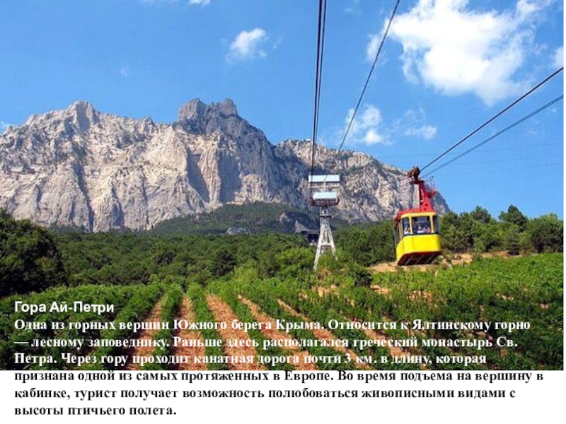 горно — лесному заповеднику. Раньше здесь располагался греческий монастырь Св. Петра. Через гору проходит канатная дорога почти 3 км. в длину, которая признана одной из самых протяженных в Европе. Во время подъема на вершину в кабинке, турист получает возможность полюбоваться живописными видами с высоты птичьего полета.