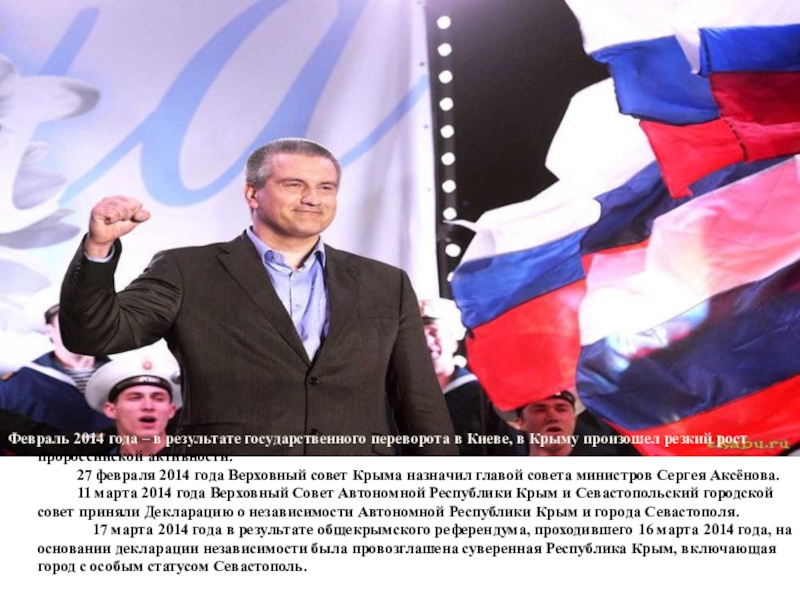 27 февраля 2014 года Верховный совет Крыма назначил главой совета министров Сергея Аксёнова.