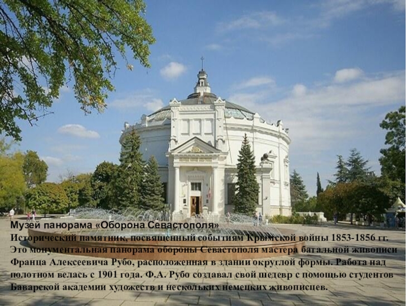 Это монументальная панорама обороны Севастополя мастера батальной живописи Франца Алексеевича Рубо, расположенная в здании округлой формы. Работа над полотном велась с 1901 года. Ф.А. Рубо создавал свой шедевр с помощью студентов Баварской академии художеств и нескольких немецких живописцев.