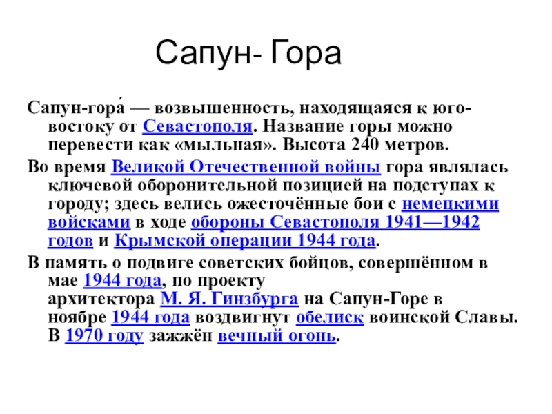 Сапун-гора́ — возвышенность, находящаяся к юго-востоку от Севастополя. Название горы можно перевести