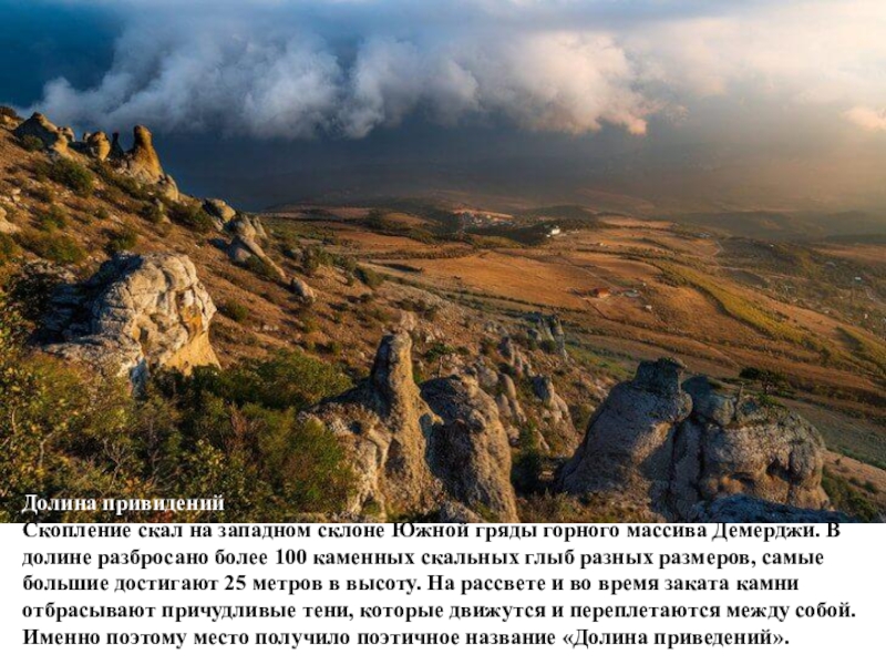 В долине разбросано более 100 каменных скальных глыб разных размеров, самые большие достигают 25 метров в высоту. На рассвете и во время заката камни отбрасывают причудливые тени, которые движутся и переплетаются между собой. Именно поэтому место получило поэтичное название «Долина приведений».