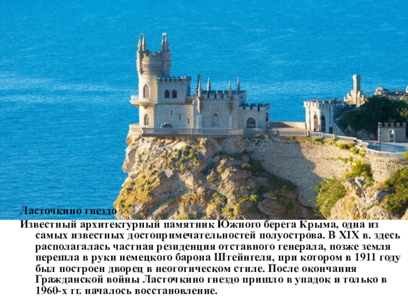 достопримечательностей полуострова. В XIX в. здесь располагалась частная резиденция отставного генерала, позже земля перешла в руки немецкого барона Штейнгеля, при котором в 1911 году был построен дворец в неоготическом стиле. После окончания Гражданской войны Ласточкино гнездо пришло в упадок и только в 1960-х гг. началось восстановление.