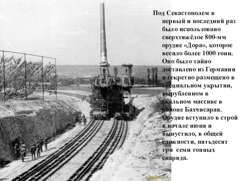 орудие «Дора», которое весило более 1000 тонн. Оно было тайно доставлено из Германии и секретно размещено в специальном укрытии, вырубленном в скальном массиве в районе Бахчисарая. Орудие вступило в строй в начале июня и выпустило, в общей сложности, пятьдесят три семи тонных снаряда.