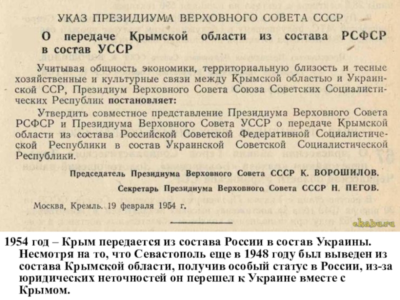 Слайд 231954 год – Крым передается из состава России в состав Украины.