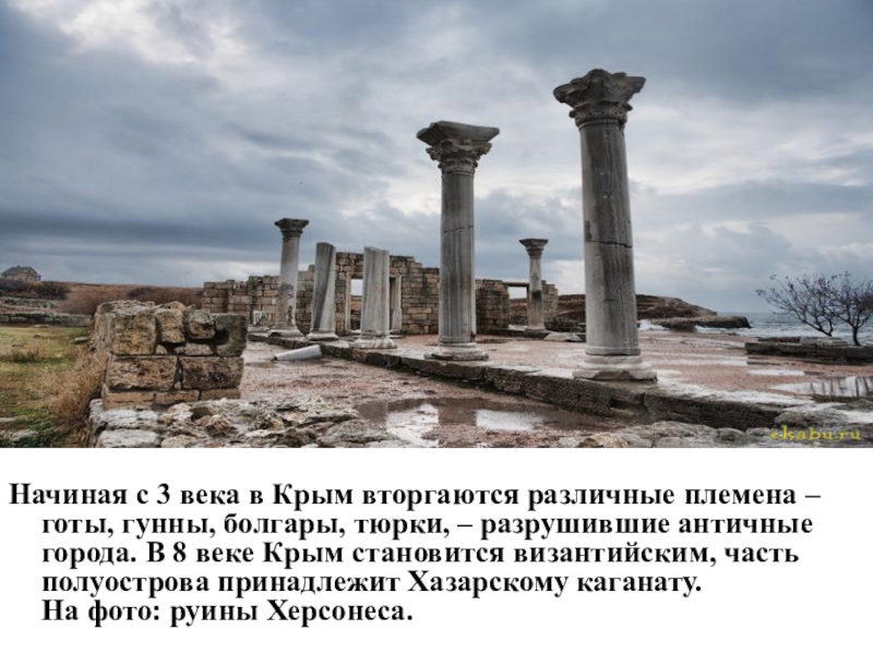 гунны, болгары, тюрки, – разрушившие античные города. В 8 веке Крым становится византийским, часть полуострова принадлежит Хазарскому каганату.