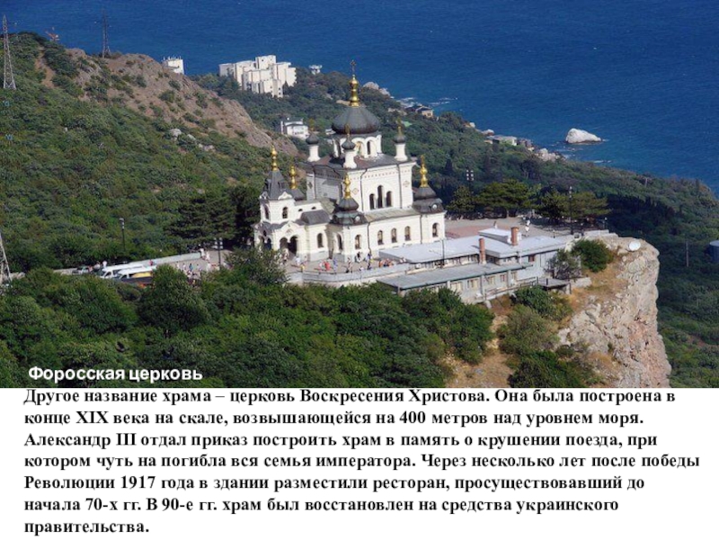 в конце XIX века на скале, возвышающейся на 400 метров над уровнем моря. Александр III отдал приказ построить храм в память о крушении поезда, при котором чуть на погибла вся семья императора. Через несколько лет после победы Революции 1917 года в здании разместили ресторан, просуществовавший до начала 70-х гг. В 90-е гг. храм был восстановлен на средства украинского правительства.