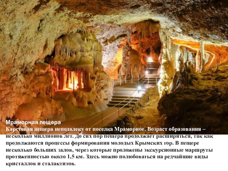 миллионов лет. До сих пор пещера продолжает расширяться, так как продолжаются процессы формирования молодых Крымских гор. В пещере несколько больших залов, через которые проложены экскурсионные маршруты протяженностью около 1,5 км. Здесь можно полюбоваться на редчайшие виды кристаллов и сталактитов.