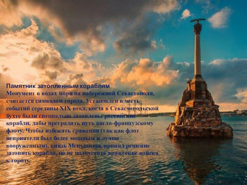 города. Установлен в честь событий середины XIX века, когда в Севастопольской бухте были специально затоплены российские корабли, дабы преградить путь англо-французскому флоту. Чтобы избежать сражения (так как флот неприятеля был более мощным и лучше вооруженным), князь Меньшиков принял решение затопить корабли, но не подпустить вражеские войска к городу.