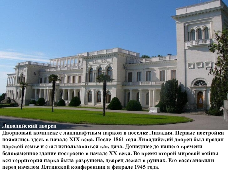 появились здесь в начале XIX века. После 1861 года Ливадийский дворец был продан царской семье и стал использоваться как дача. Дошедшее до нашего времени белокаменное здание построено в начале XX века. Во время второй мировой войны вся территория парка была разрушена, дворец лежал в руинах. Его восстановили перед началом Ялтинской конференции в феврале 1945 года.