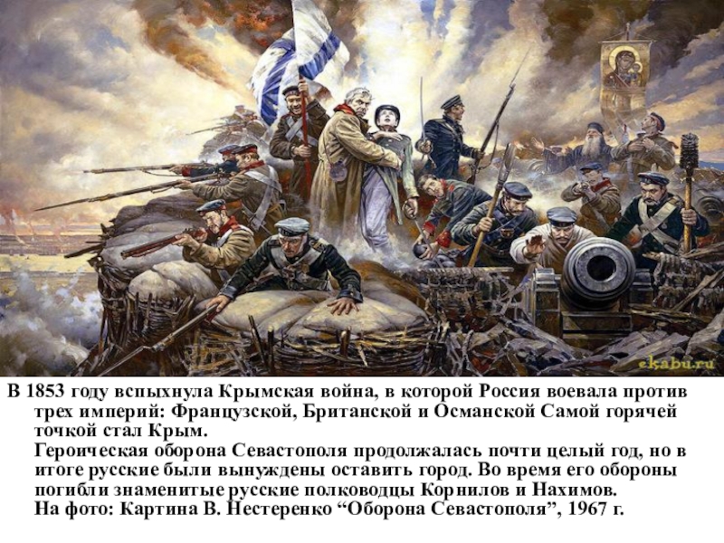 Героическая оборона Севастополя продолжалась почти целый год, но в итоге русские были вынуждены оставить город. Во время его обороны погибли знаменитые русские полководцы Корнилов и Нахимов.
