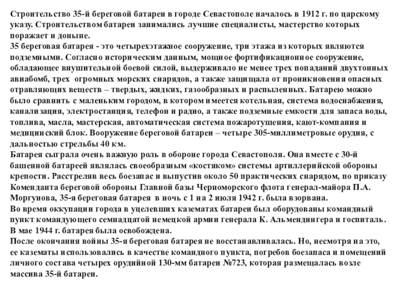 Слайд 32Строительство 35-й береговой батареи в городе Севастополе началось в 1912 г.