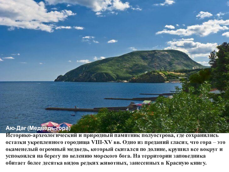 VIII-XV вв. Одно из преданий гласит, что гора – это окаменелый огромный медведь, который скитался по долине, крушил все вокруг и успокоился на берегу по велению морского бога. На территории заповедника обитает более десятка видов редких животных, занесенных в Красную книгу.