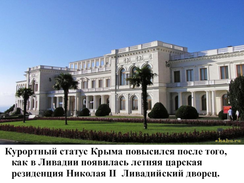 Слайд 17 Курортный статус Крыма повысился после того, как в Ливадии появилась летняя