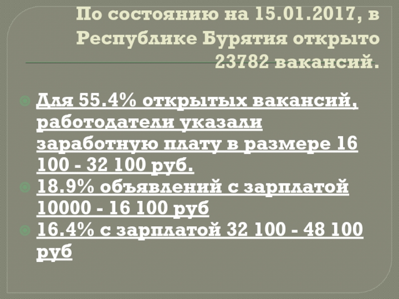 Слайд 9По состоянию на 15.01.2017, в Республике Бурятия открыто 23782 вакансий.