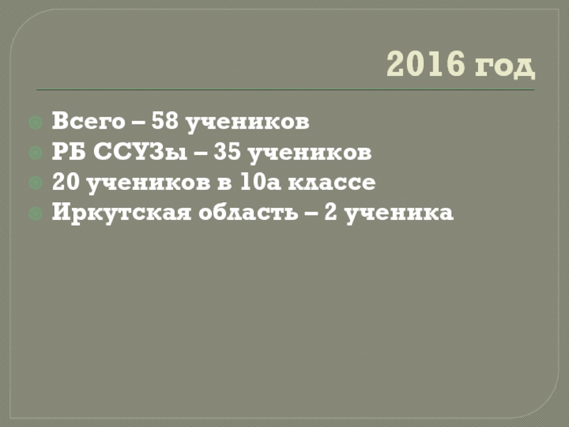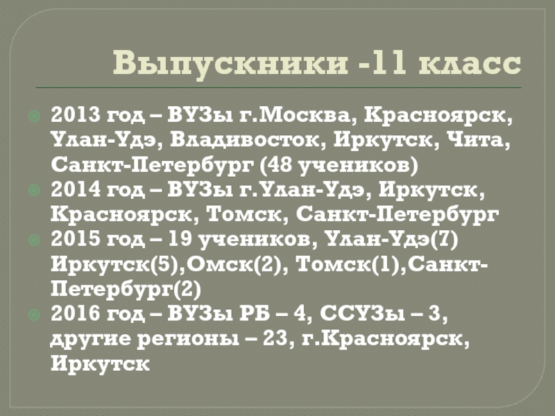 2016 год – ВУЗы РБ – 4, ССУЗы – 3, другие регионы – 23, г.Красноярск, Иркутск