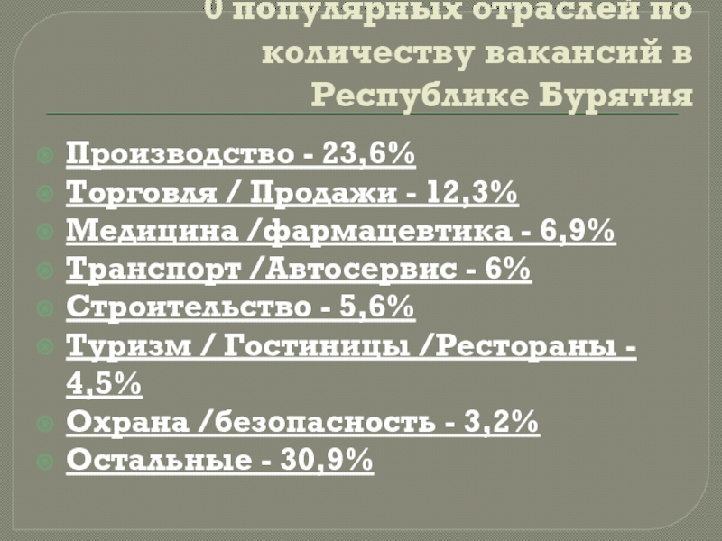 Слайд 100 популярных отраслей по количеству вакансий в Республике Бурятия
