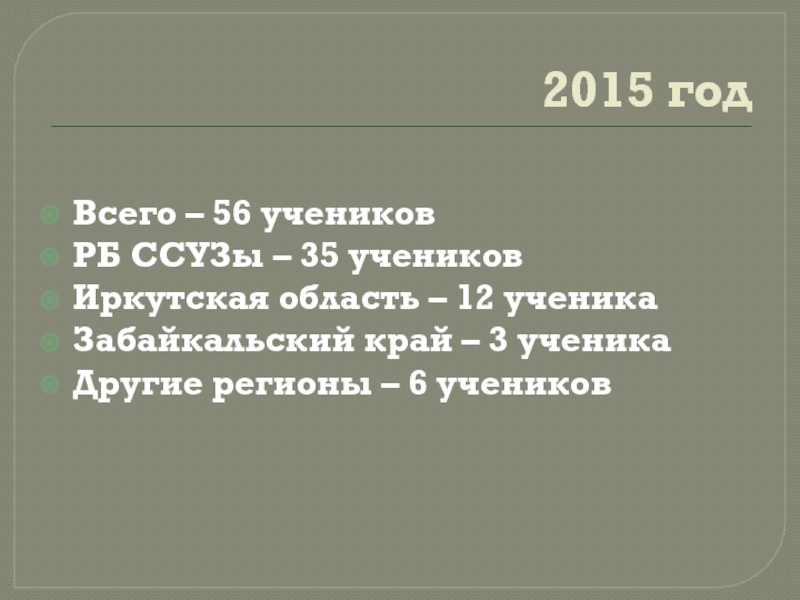 2015 год – 19 учеников, Улан-Удэ(7) Иркутск(5),Омск(2), Томск(1),Санкт-Петербург(2)