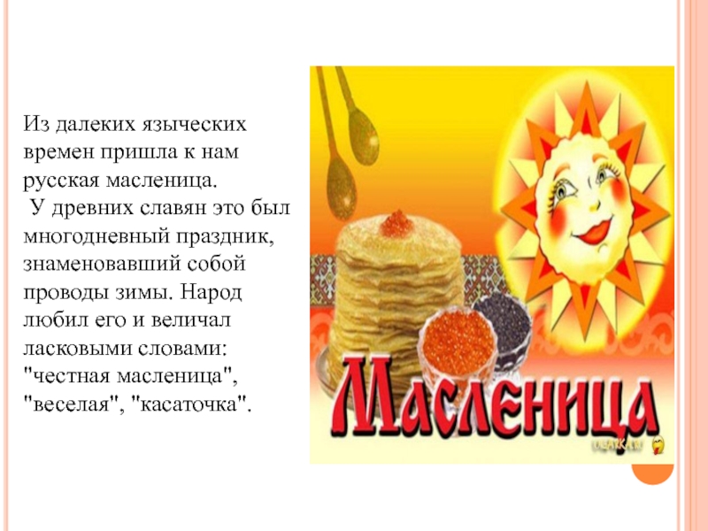 славян это был многодневный праздник, знаменовавший собой проводы зимы. Народ любил его и величал ласковыми словами: "честная масленица", "веселая", "касаточка".