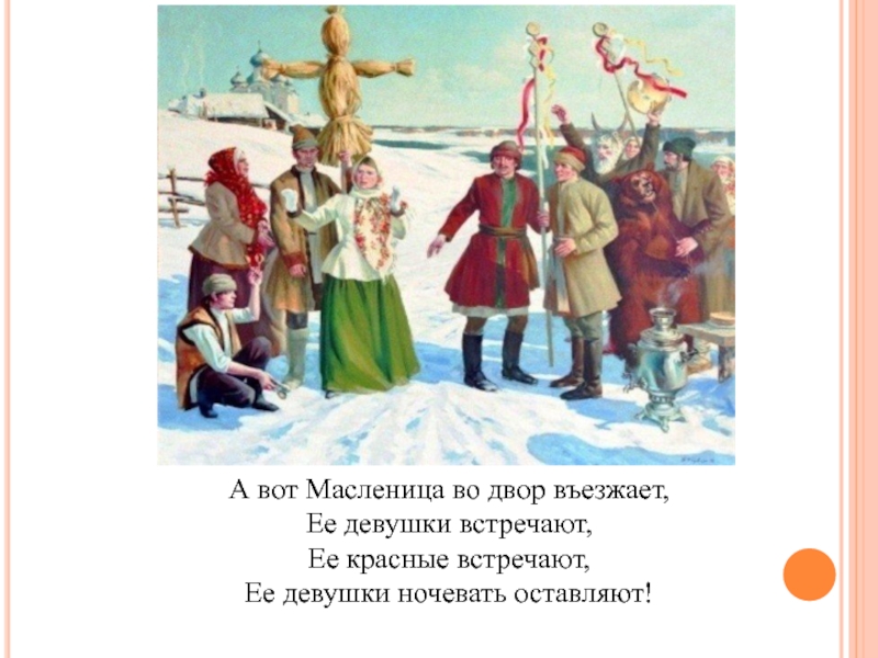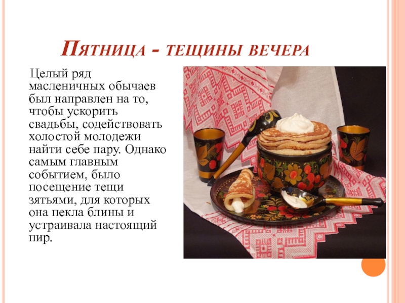 на то, чтобы ускорить свадьбы, содействовать холостой молодежи найти себе пару. Однако самым главным событием, было посещение тещи зятьями, для которых она пекла блины и устраивала настоящий пир.