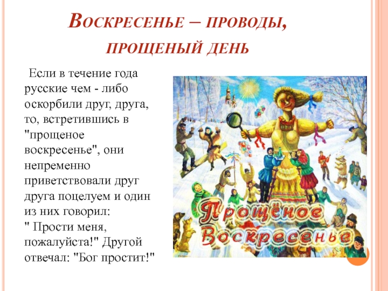 русские чем - либо оскорбили друг, друга, то, встретившись в "прощеное воскресенье", они непременно приветствовали друг друга поцелуем и один из них говорил: " Прости меня, пожалуйста!" Другой отвечал: "Бог простит!"