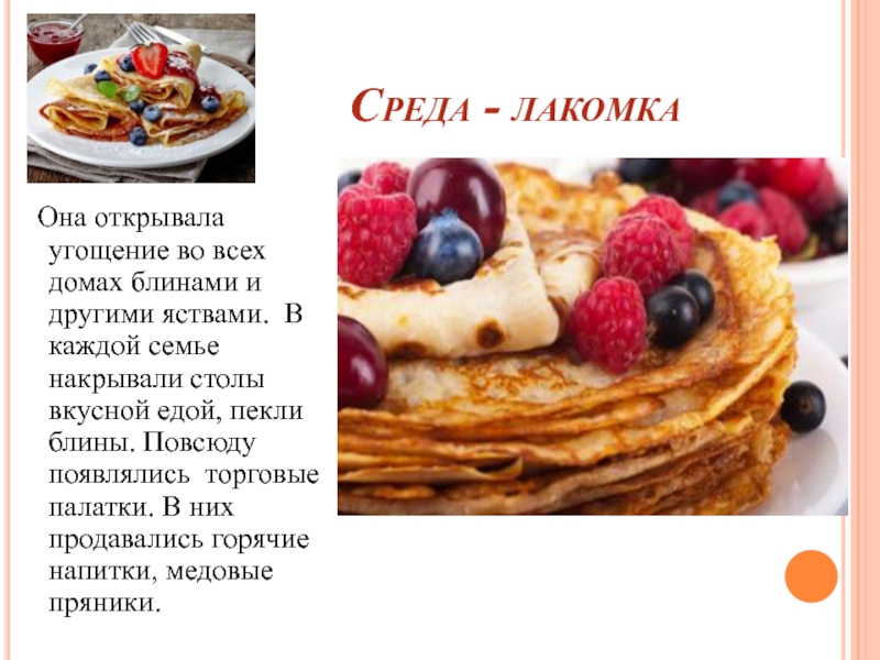 другими яствами. В каждой семье накрывали столы вкусной едой, пекли блины. Повсюду появлялись торговые палатки. В них продавались горячие напитки, медовые пряники.
