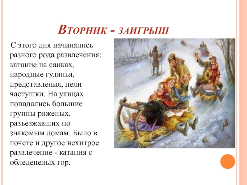катание на санках, народные гулянья, представления, пели частушки. На улицах попадались большие группы ряженых, разъезжавших по знакомым домам. Было в почете и другое нехитрое развлечение - катания с обледенелых гор.