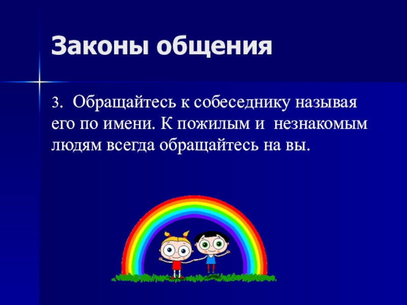 Законы общения3. Обращайтесь к собеседнику называя его по имени. К пожилым и незнакомым людям всегда обращайтесь на