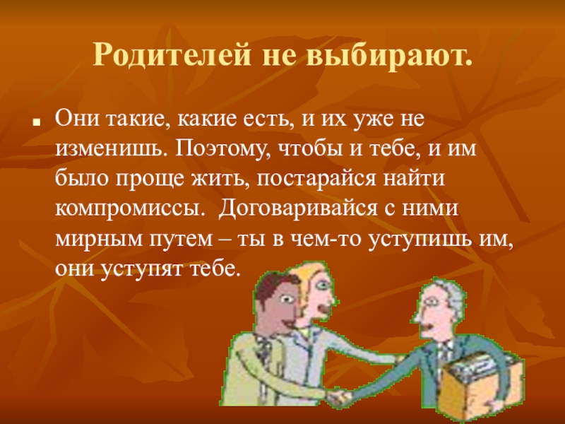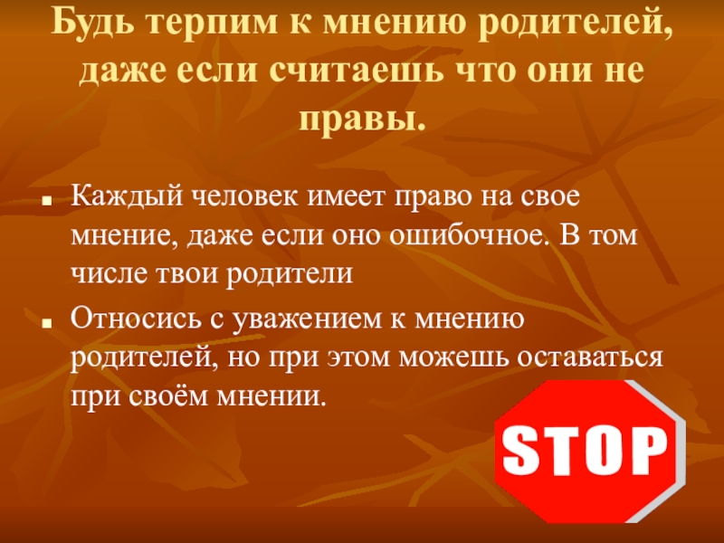 Относись с уважением к мнению родителей, но при этом можешь оставаться при своём мнении.