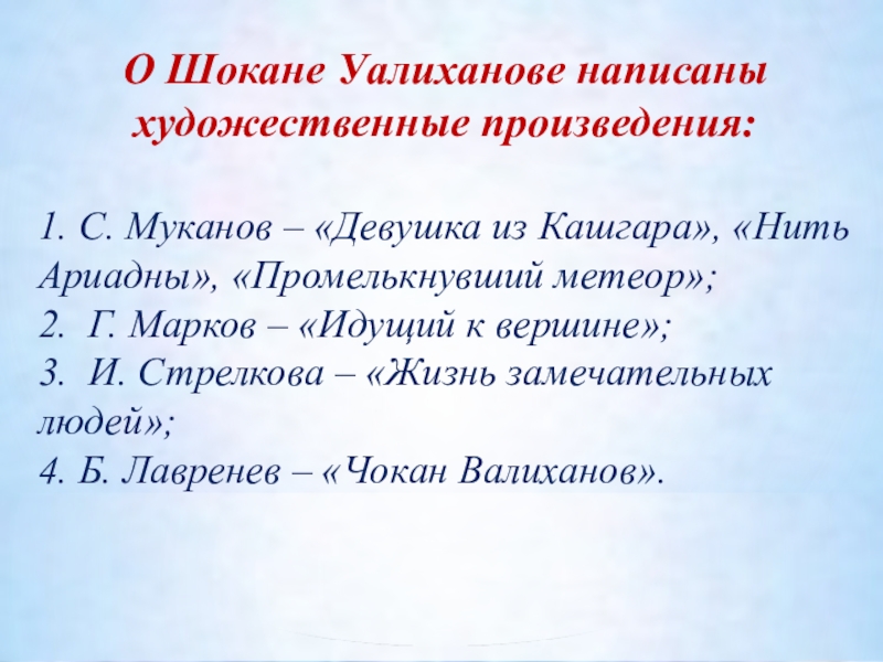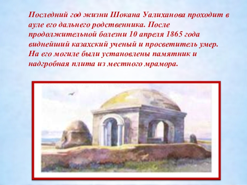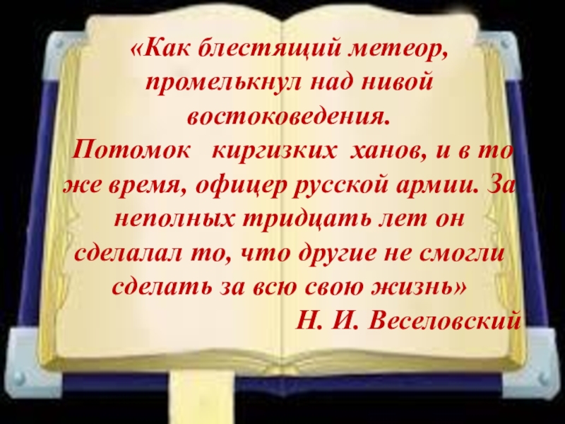 Какими страстями и думами, сомнениями и надеждами жил в степи Чокан — гигант духа земли казахской, именно об этом вдохновенно и ярко пишет драматург Шота Валиханов, внучатый племянник ученого.