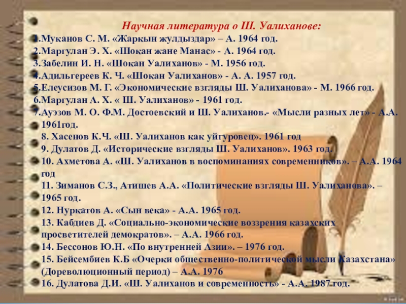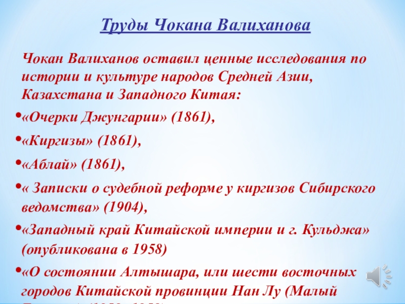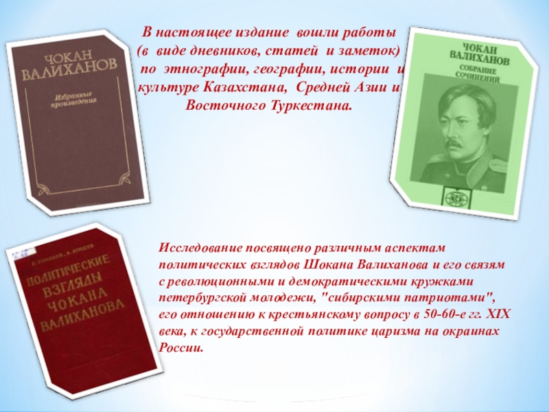Исследование посвящено различным аспектам политических взглядов Шокана Валиханова и его связям с революционными и демократическими кружками петербургской молодежи, "сибирскими патриотами", его отношению к крестьянскому вопросу в 50-60-е гг. XIX века, к государственной политике царизма на окраинах России.