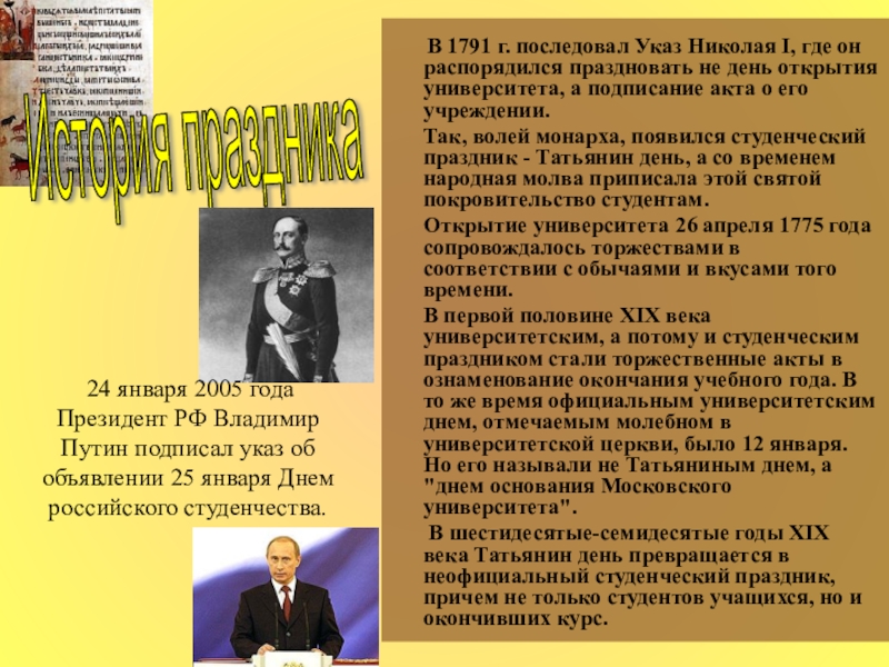24 января 2005 года Президент РФ Владимир Путин подписал указ об объявлении 25 января Днем российского студенчества.