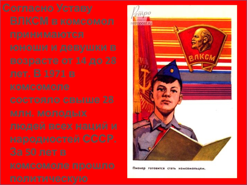 от 14 до 28 лет. В 1971 в комсомоле состояло свыше 28 млн. молодых людей всех наций и народностей СССР. За 50 лет в комсомоле прошло политическую школу более 100 млн. советских людей.