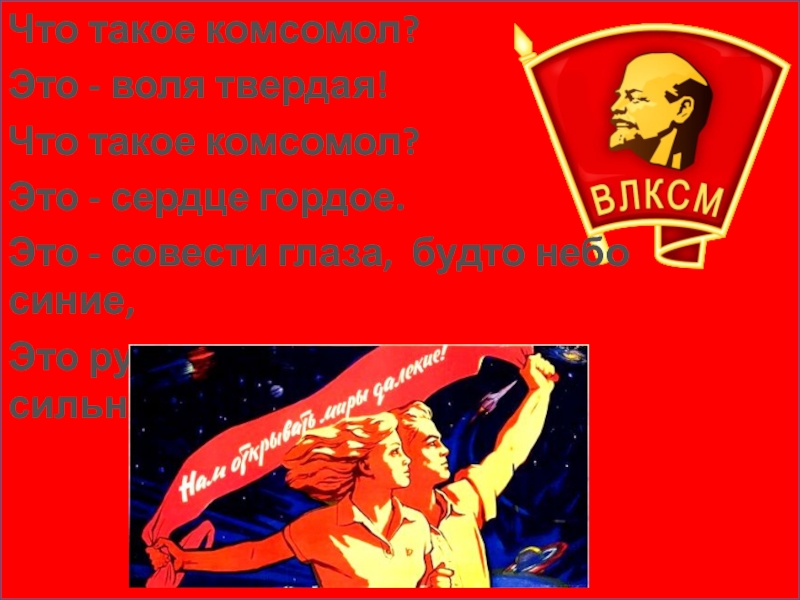 Девиз: Не расстанусь с Комсомолом, буду вечно молодым.