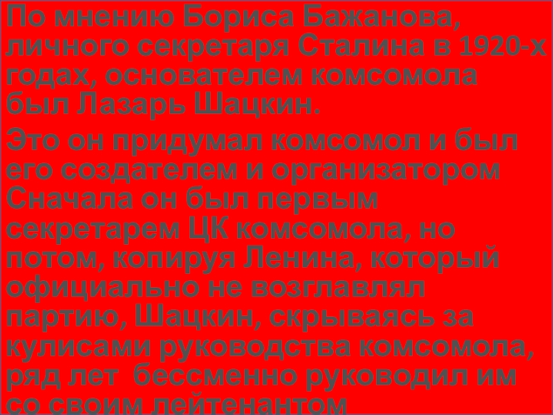 Слайд 9По мнению Бориса Бажанова, личного секретаря Сталина в 1920-х годах, основателем комсомола был Лазарь Шацкин.